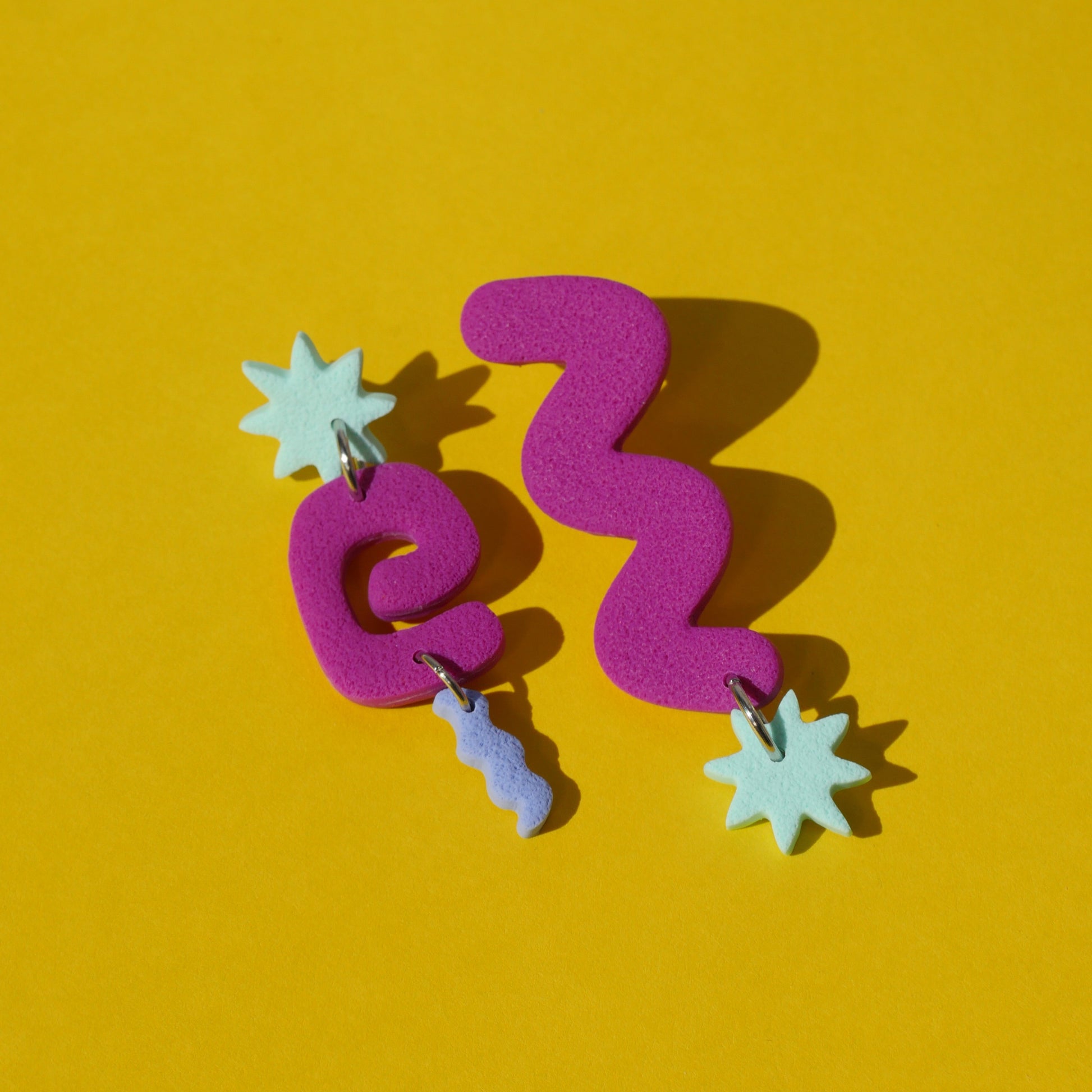 Boucles d'oreilles argile polymère - Asymétrique fushia | Collection Millie
