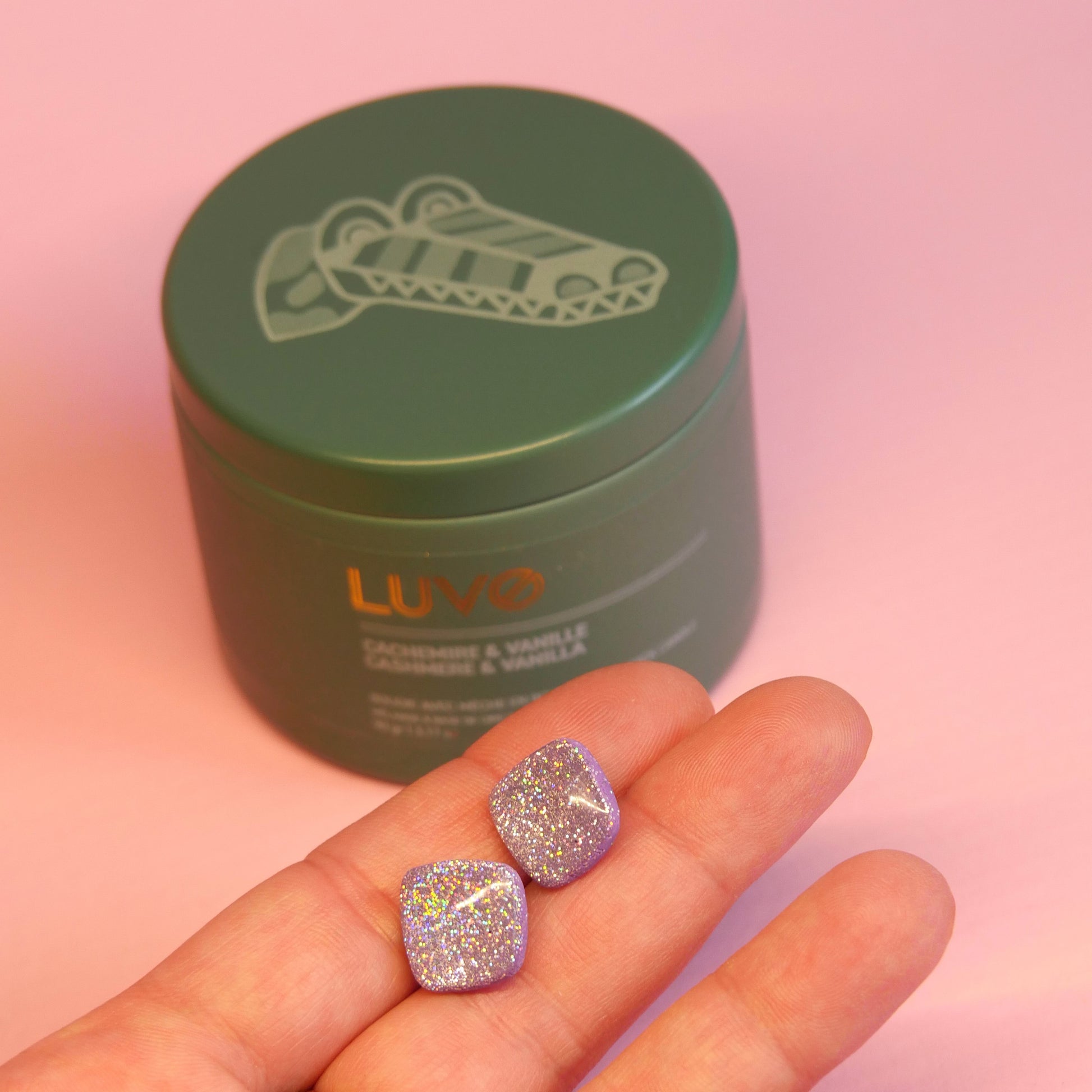 Lorsque la bougie fond, un pochon étanche apparaît, révélant une paire de mini-clous d’oreilles en argile polymère, scintillants et faits main par Crocodile Agile.